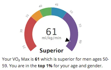 The picture at the top of the page is of my own wrist. So that figure of 61 is what my Garmin has estimated my current VO2 Max to be.